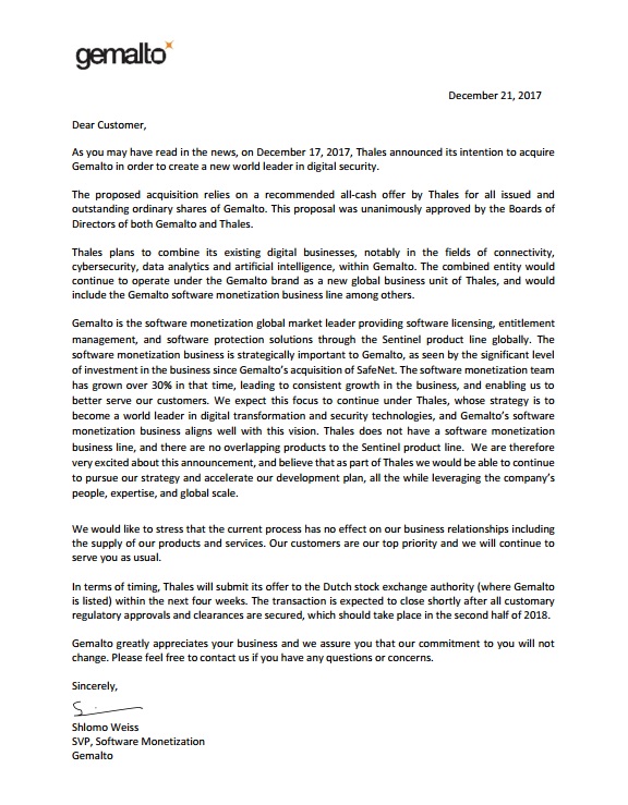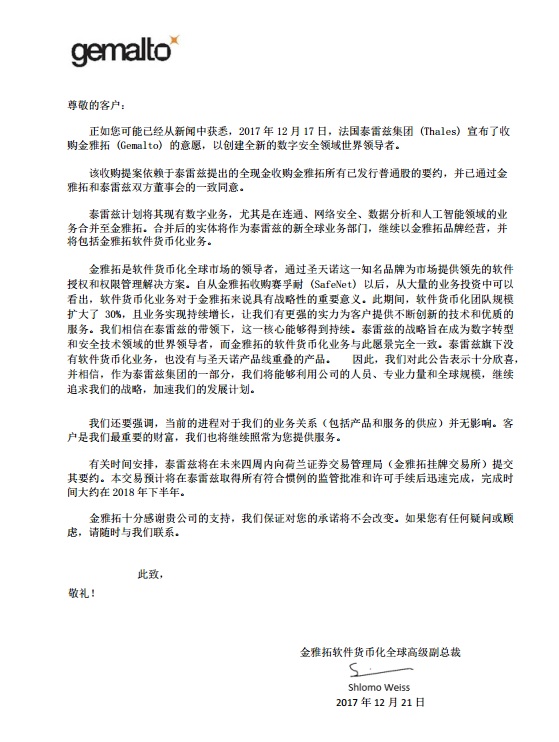 致用戶公開信-法國泰雷茲集團(tuán) (Thales) 宣布了收購金雅拓 (Gemalto) 的意愿