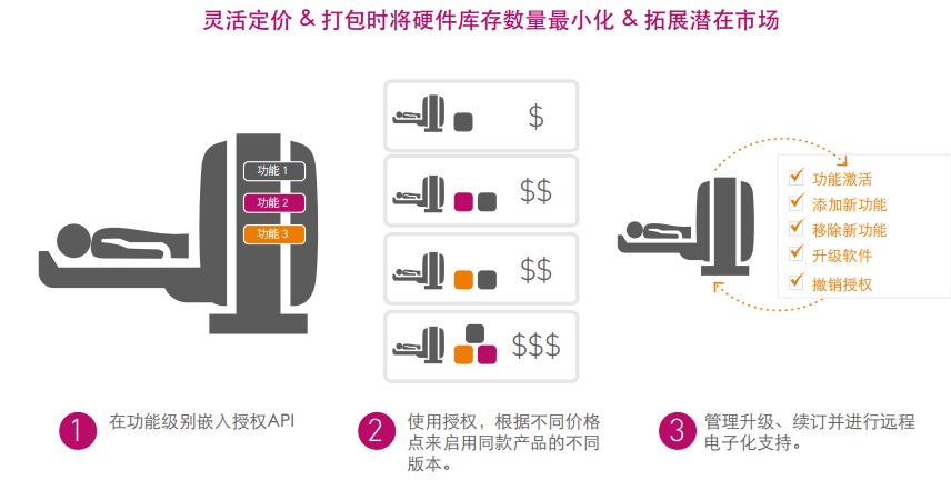 當(dāng)您將功能級(jí)授權(quán)以及打包能力搭建到硬件產(chǎn)品目錄中時(shí),即可真正提升單個(gè)硬件設(shè)備在大量多樣化市場(chǎng)中的總體可用性。停用或移除“基本”版本設(shè)備的高級(jí)功能意味著能以更低的價(jià)格提供該設(shè)備,從而贏得低端市場(chǎng)?;蛘?,設(shè)備供應(yīng)商也可以對(duì)一些為高端客戶或縫隙市場(chǎng)提供附加價(jià)值的高級(jí)功能收取額外費(fèi)用。有一點(diǎn)是確定無疑的,醫(yī)療設(shè)備供應(yīng)商若不具備將硬件及解決方案各項(xiàng)功能貨幣化的能力,其市場(chǎng)適用性或產(chǎn)品定價(jià)會(huì)受到極大限制,這也等同于喪失了收入機(jī)會(huì)。
