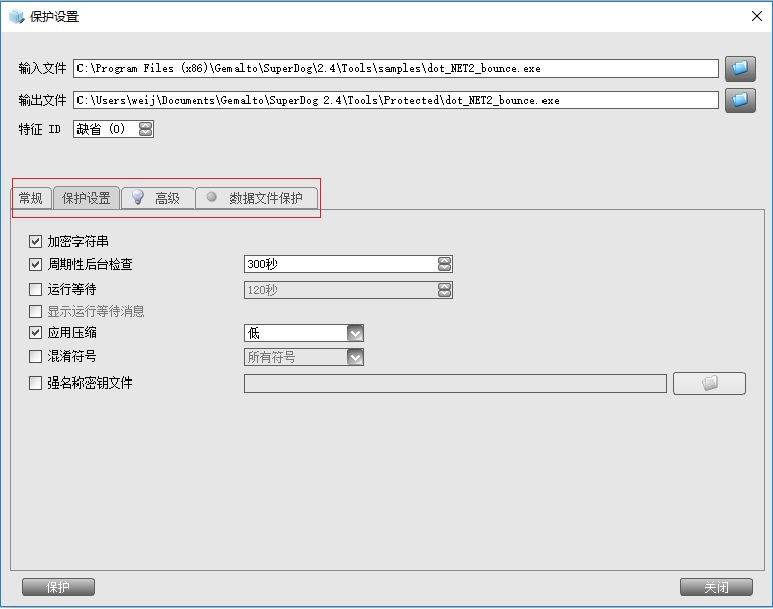 其中“周期性后臺檢查”設(shè)置加密后的程序后臺默認(rèn)檢查加密狗的頻率,即拔掉后程序反應(yīng)的時(shí)間。