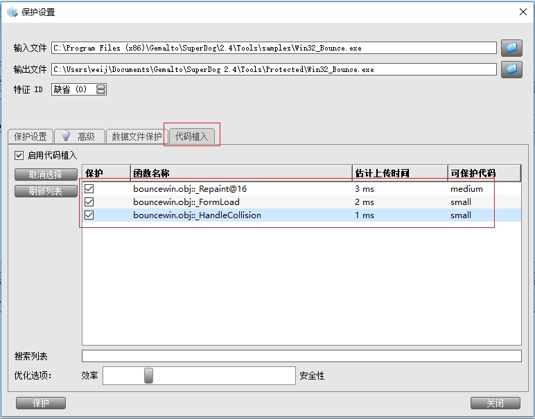 將被加密程序和map文件放同一目錄,加密時(shí)在“代碼植入”選項(xiàng)中選擇可以支持在加密狗中運(yùn)行的代碼。該部分代碼在加密后不會直接在電腦中運(yùn)行,而是通過加密狗運(yùn)行并向程序返回運(yùn)行結(jié)果。哪些代碼可以在加密狗中運(yùn)行由加密工具自動判斷,函數(shù)代碼太短可能無法被加密工具識別,太長可能會影響運(yùn)行效率,具體根據(jù)實(shí)際程序代碼情況需要多次測試。使用代碼植入功能需要包含map文件,點(diǎn)擊此處查看如何生成map文件->>>>>>>