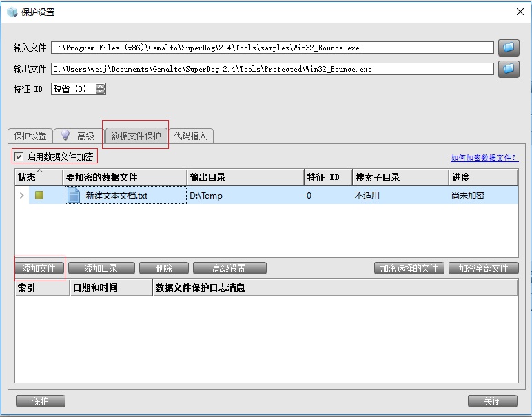 某個視頻文件要加密、程序中調(diào)用的數(shù)據(jù)文件不想被看到、或者一些exe / dll以外的程序運(yùn)行時(shí)需要加密狗的驗(yàn)證,就可以使用數(shù)據(jù)文件功能。