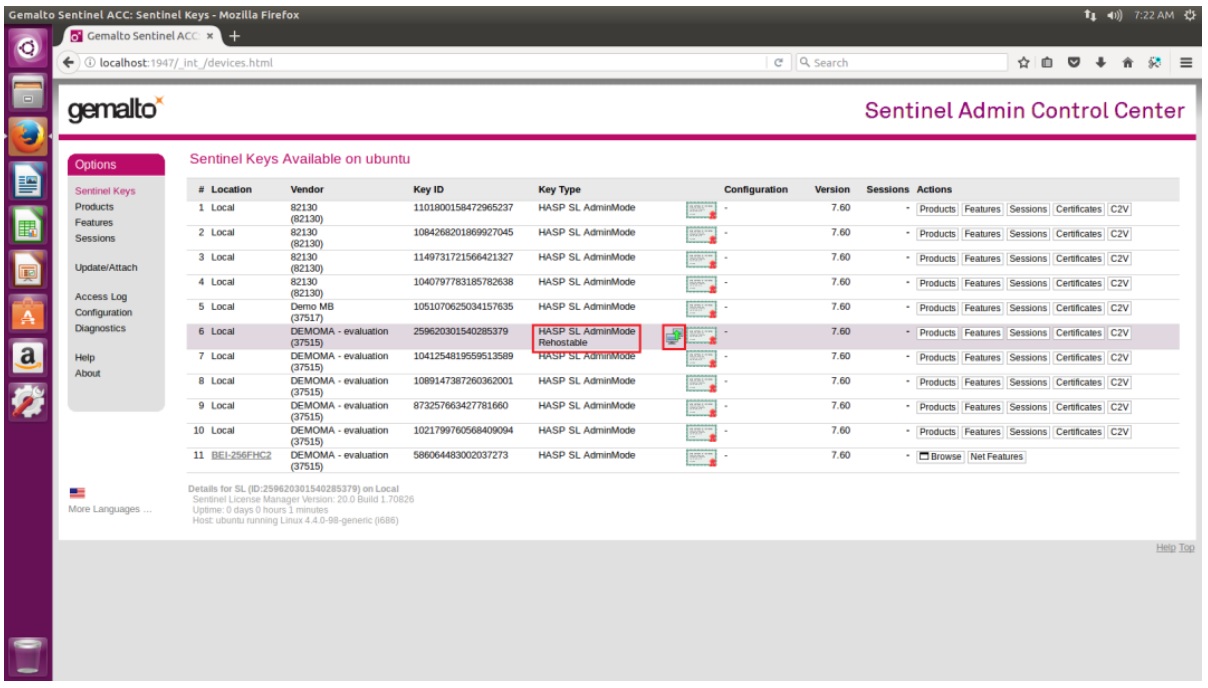 SL能夠?qū)崿F(xiàn) Rehost 的前提條件是 SL本身是可遷移的,也就是 Rehostable 的??梢赃M(jìn)入 A 電腦上打開 ACC(瀏覽器打開 http://localhost:1947,點擊 Sentinel Keys 查看 SL的狀態(tài)),如下邊截圖所示紅色框?qū)?yīng)的這個 SL就是 Rehostable的,可以遷移,其它SL都不可遷移。如果想遷移其它 SL,就必須將 SL升級為具備 Rehostable 屬性。 具體請看下邊的步驟二。