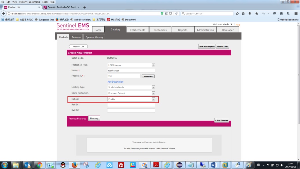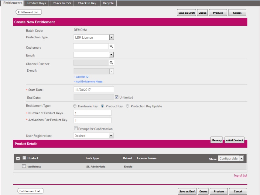 (c、 )去 EMS 里邊Entitlement 標(biāo)簽頁下,像正常升級加密鎖一樣的標(biāo)準(zhǔn)步驟進(jìn)行操作。新建 Entitlement,然后Entitlement type選擇中間的Product Key,添加上剛才定義的產(chǎn)品testRehost,然后點擊 Produce,接著 Activate。