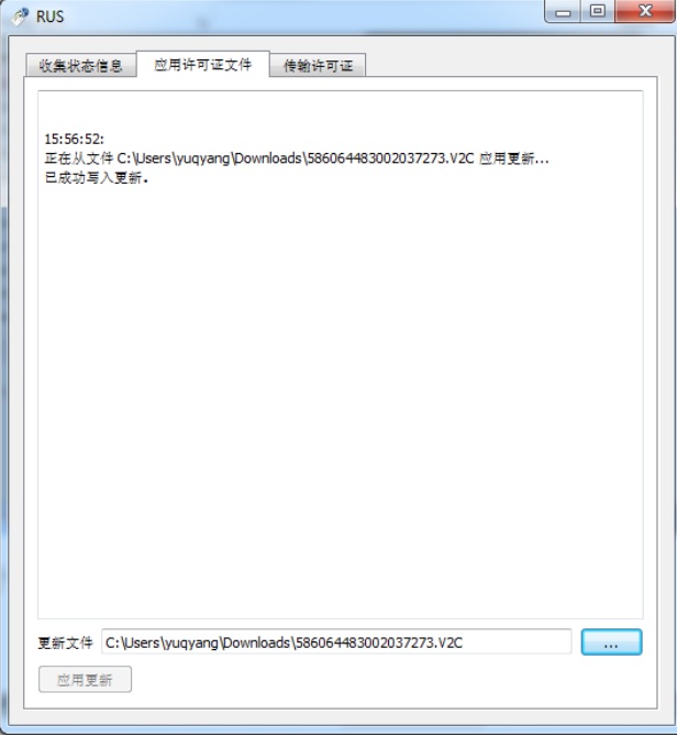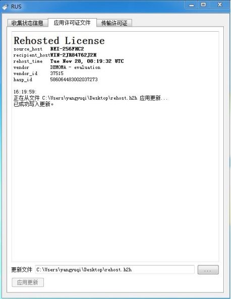 在B電腦上,運行RUS,如下邊截圖,應(yīng)用許可證文件 rehost.h2h,點擊左下角按鈕“應(yīng)用更新”即可。