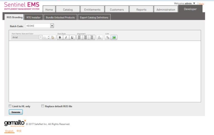 去開發(fā)電腦上打開 EMS,進(jìn)入 Developer 標(biāo)簽頁,可以看到RUS Branding標(biāo)簽頁, BatchCode選擇你的正式號(比如截圖中的 KEOKE),插上主鎖,點擊左下角的 Generate,就可以產(chǎn)生正式號對應(yīng)的 RUS 遠(yuǎn)程升級工具。