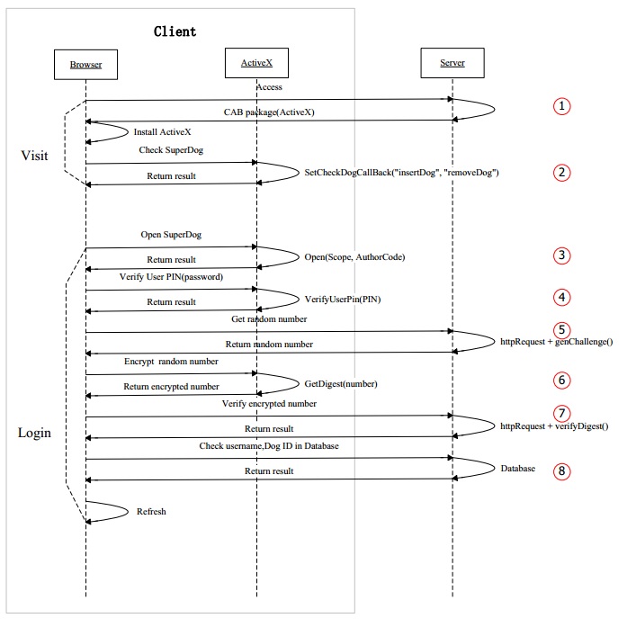 超級狗利用內(nèi)置算法采用查詢響應的方式對訪問者身份進行驗證和確認。