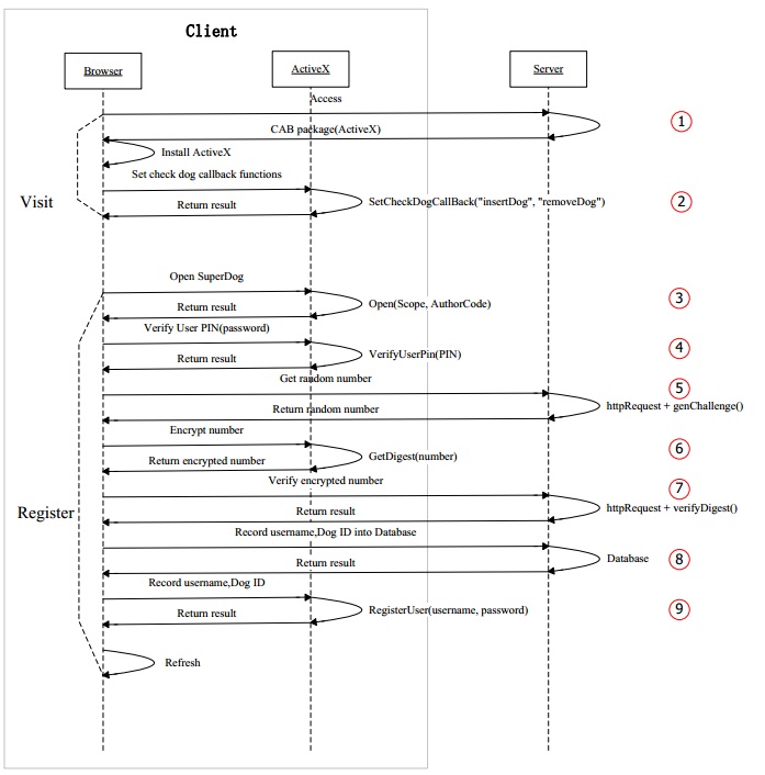 9. 數(shù)據(jù)庫寫入成功后,調(diào)用 ActiveX 控件的 RegisterUser(username, PIN)方法,把注冊信息寫入到超級狗里。