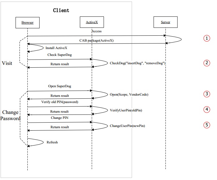 4. 頁面的 javascript 代碼調(diào)用控件的 VerifyUserPin(PIN) 方法,驗證用戶輸入的舊口令與超級狗中的口令是否一致。