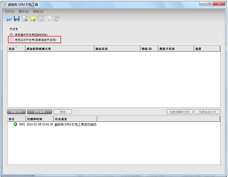 2. 運(yùn)行超級(jí)狗 DRM 打包工具(<超級(jí)狗安裝目錄>\Tools 目錄下的 dataencrypt.exe),加密要保護(hù)的 Office 文檔和 PDF 文檔。