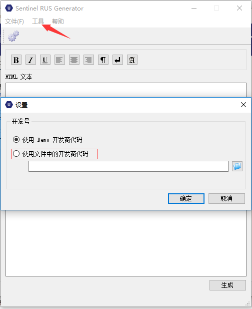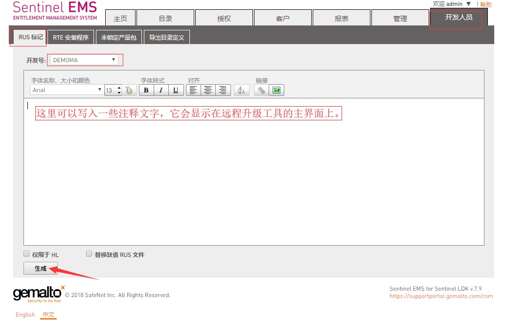 登錄EMS,在“開發(fā)人員”界面,選“RUS標(biāo)記”,選擇自己的主鎖開發(fā)號(hào),填入適當(dāng)?shù)淖⑨屛淖郑ㄒ部梢圆惶睿?,左下角點(diǎn)生成,系統(tǒng)會(huì)生成一個(gè)“RUS”開頭的exe文件。