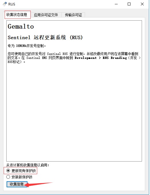 選擇“更新現(xiàn)有的保護(hù)鎖”,點(diǎn)擊收集信息,會(huì)生成一個(gè)擴(kuò)展名為.c2v的文件,將此文件保存后發(fā)給軟件開發(fā)商。