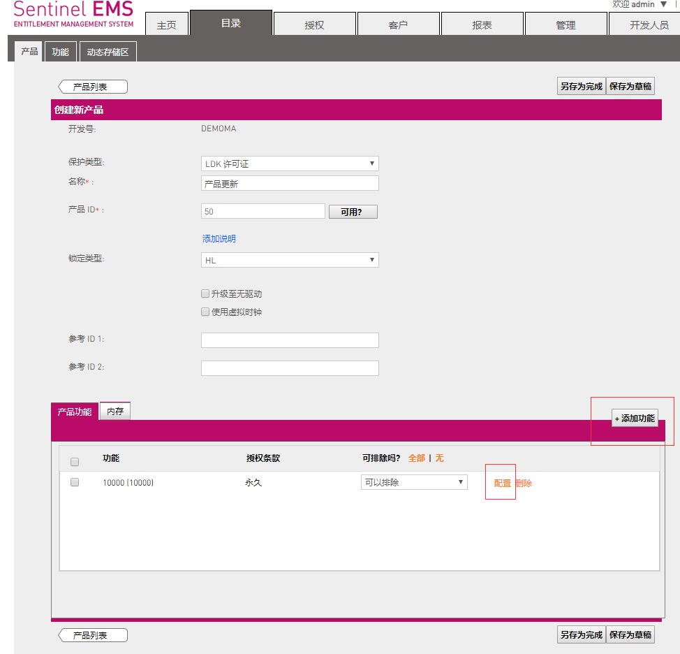 (2).在新建產(chǎn)品頁面,添加新的Feature ID或在“配置”中修改原來加密鎖中的Feature ID屬性(如修改到期時(shí)間等)