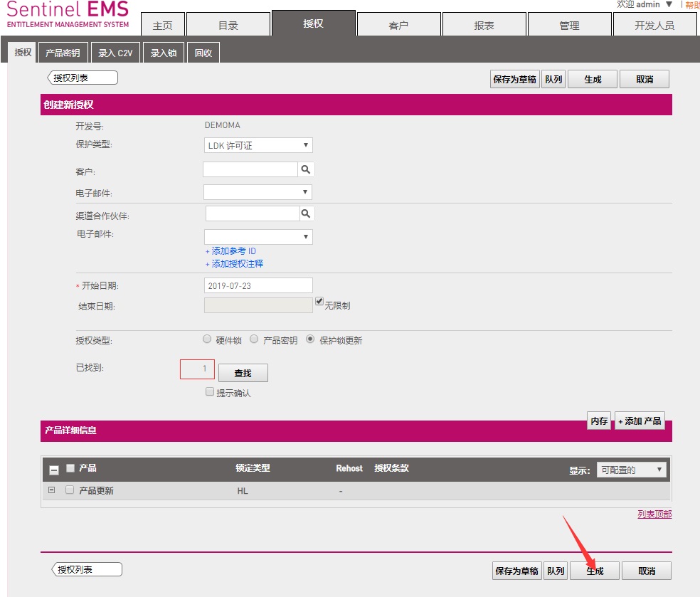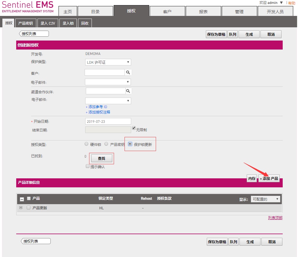 3、軟件開發(fā)商在收到此c2v文件后,將此文件錄入到EMS中,然后將需要更新或添加的內(nèi)容按正常子鎖授權(quán)流程新建產(chǎn)品和新建訂單。