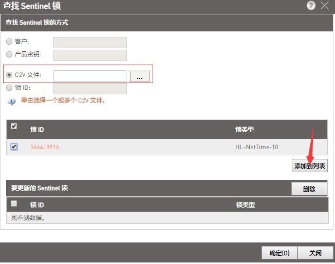(4). 用c2v文件方式選擇客戶傳回來的.c2v文件,點(diǎn)擊“添加到列表”,最后點(diǎn)確定返回到主界面。(小技巧:如果待更新的加密鎖是此電腦之前燒制過的,也可以直接選“鎖ID”并輸入加密鎖的ID號(hào),就可以省掉前面從用戶處收集.c2v文件這步操作。)