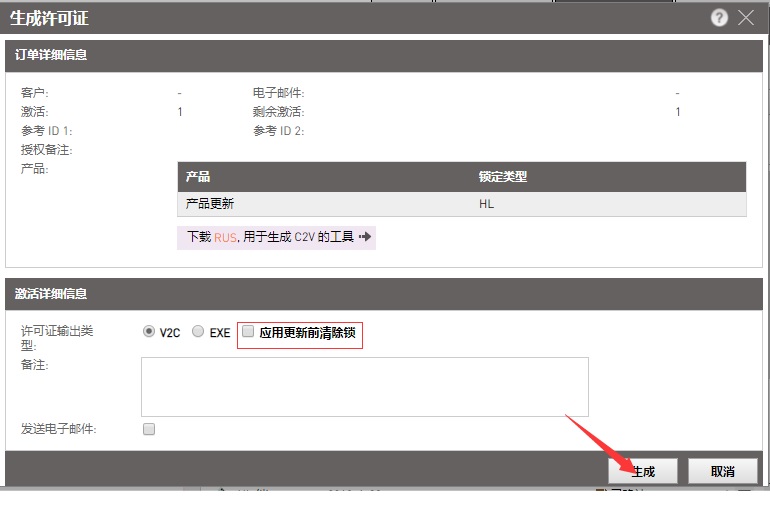 4、生成一個(gè)升級(jí)文件,可以選擇v2c或exe方式(v2c通過RUS工具升級(jí),exe是直接運(yùn)行升級(jí),LDK9.0以后不再支持exe方式),如果升級(jí)時(shí)同時(shí)需要清除原加密鎖中的內(nèi)容,請(qǐng)勾選“應(yīng)用更新前清除鎖”。