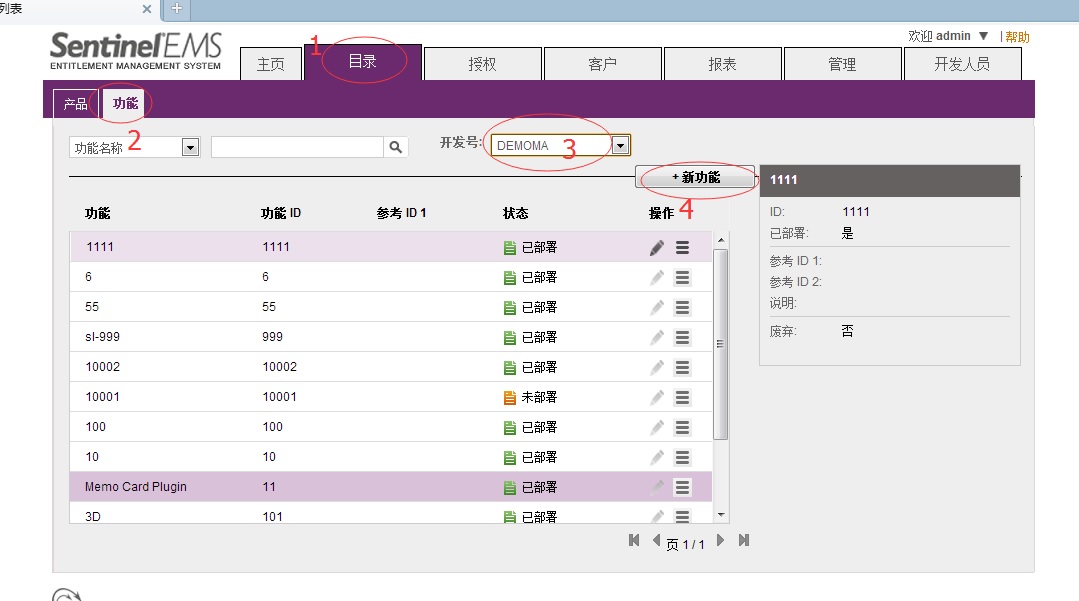 按圖中1目錄,2功能,3選擇開發(fā)號(hào),4新建功能這樣的步驟操作