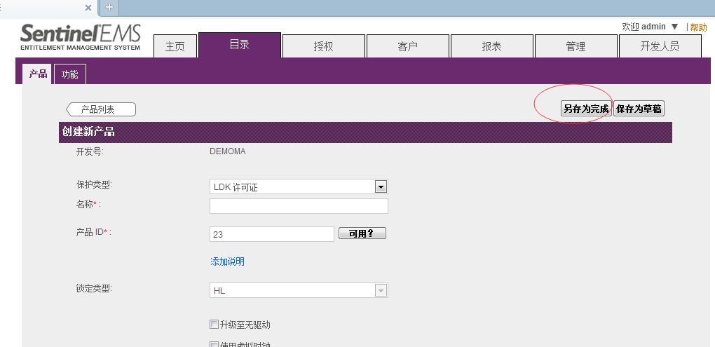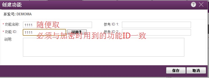 創(chuàng)建功能,這里的功能ID就是加密時(shí)選擇的feature ID,必須一致;功能名稱隨便取,一般與功能ID名字保持一致。填完以后點(diǎn)保存。