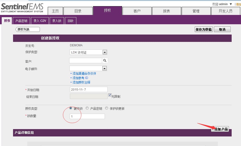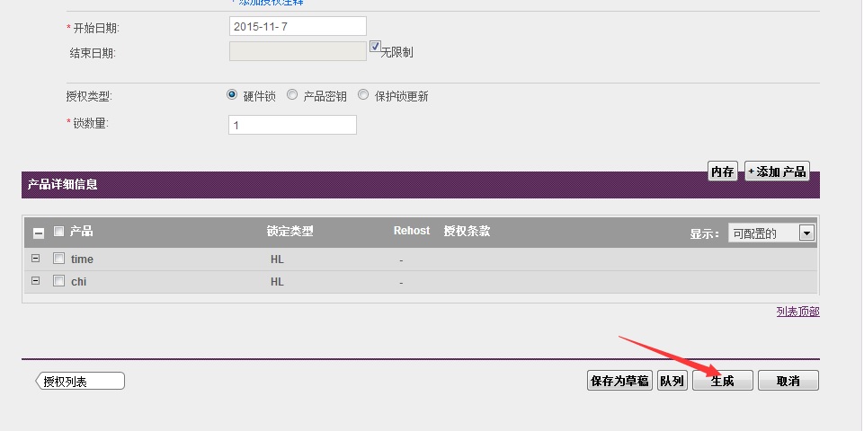 填入要寫鎖的數(shù)量,并通過“添加產(chǎn)品”把之前定義好的產(chǎn)品添加進(jìn)來(lái)。