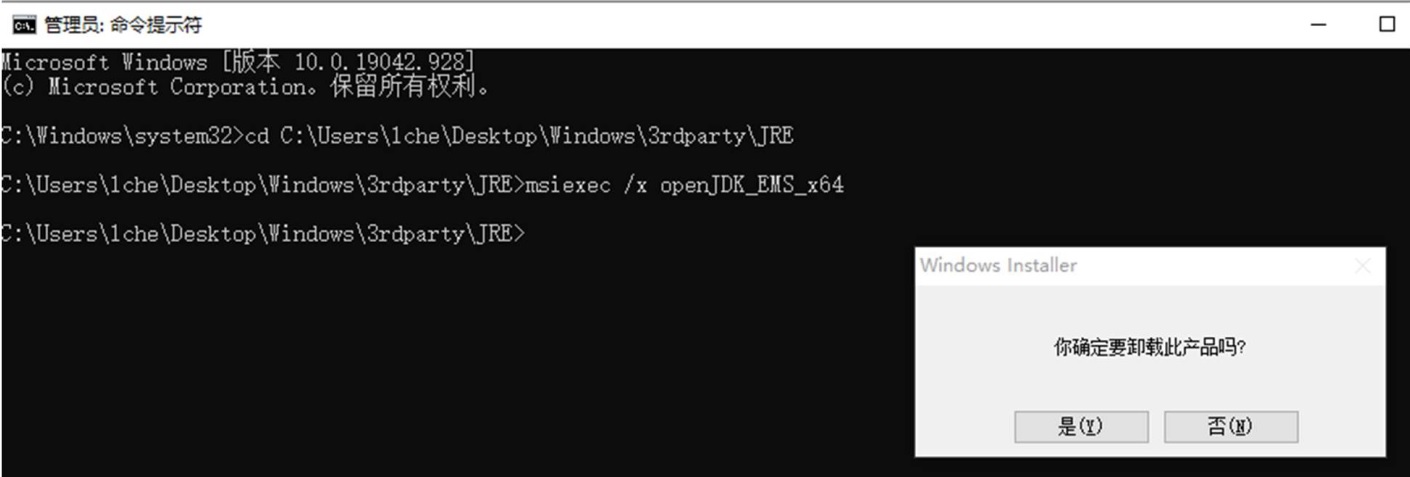 以管理員權(quán)限打開 cmd.exe,進入到 LDK 8.2 安裝包的 \Windows\3rdparty\JRE 路徑下,輸入命令 msiexec /uninstall openJDK_EMS_x64 或 msiexec /x openJDK_EMS_x64。