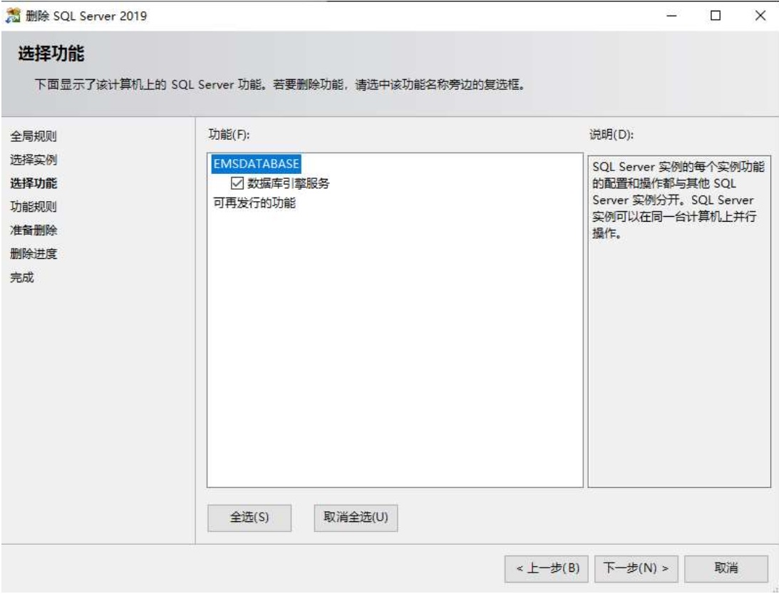 從控制面板卸載 “Microsoft SQL Server 2019 (64bit)”,卸載時打勾 EMSDATABASE 的 “數(shù)據(jù)庫引擎服務(wù)”。