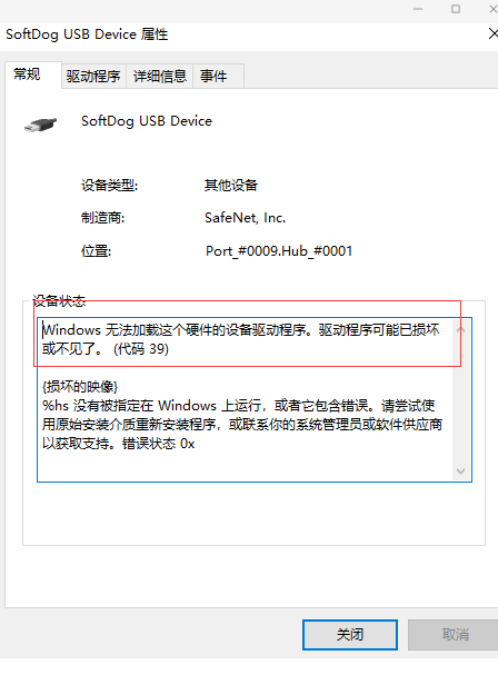 軟件狗、微狗和宏狗在win10環(huán)境中驅(qū)動(dòng)安裝成功,但在設(shè)備管理器中查看帶嘆號(hào),點(diǎn)擊帶嘆號(hào)的設(shè)備,詳細(xì)頁(yè)面中有39錯(cuò)誤代碼,