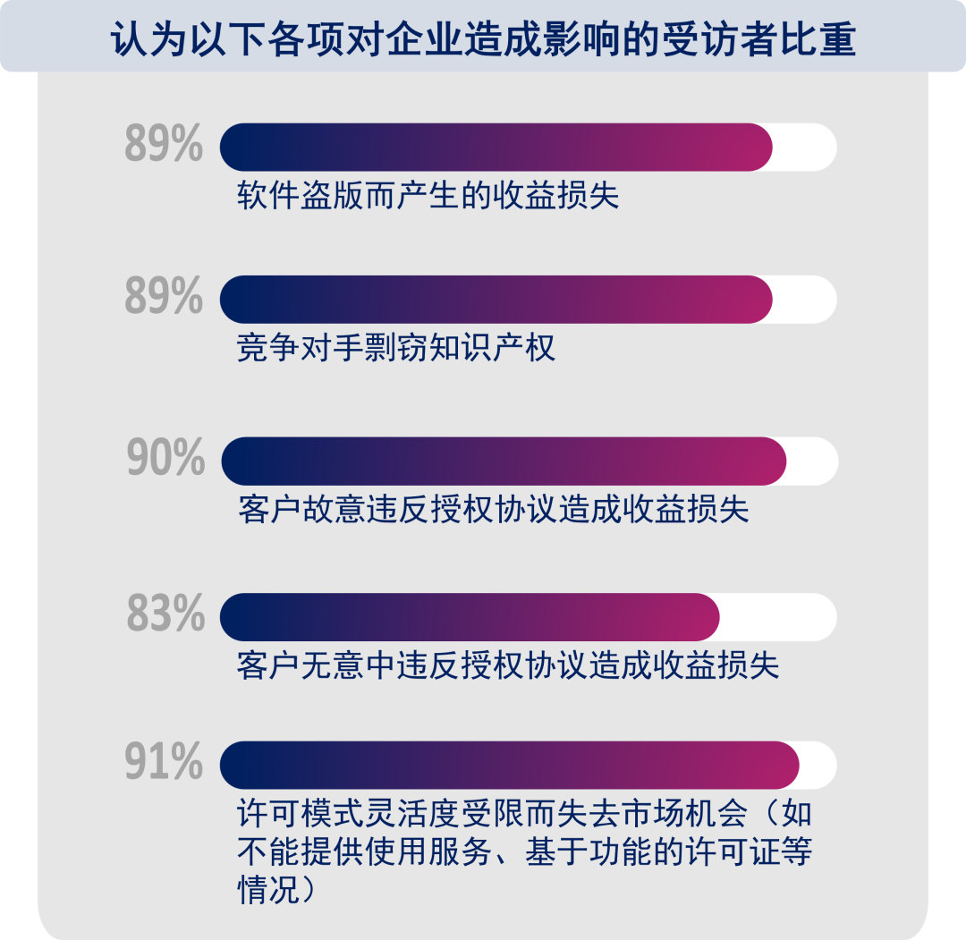 數(shù)字時代前進的步伐已勢如破竹,而軟件則承載著各大廠商的核心競爭力,軟件受到侵害,核心競爭力首當其沖。據(jù)報告顯示,90%的廠商擔心軟件會遭到侵害,據(jù)估計,其中有超過四分之一的軟件未經許可被濫用或盜用,導致效益、競爭力、業(yè)務機會等方面的利益受損。然而,維系客戶關系仍是軟件廠商未來長期收入的“黑馬”,如何在保護自身知識產權的同時還能夠打造可持續(xù)的業(yè)務收入模式,平衡二者關系成為了軟件廠商需要面對的挑戰(zhàn)。