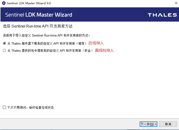 默認(rèn)是從Thales網(wǎng)站下載,如果不能聯(lián)網(wǎng)或者下載過程中報錯, 可選擇從Thales經(jīng)銷商提供的離線包中提取。離線包可向經(jīng)銷商申請,一般需要一個工作日。